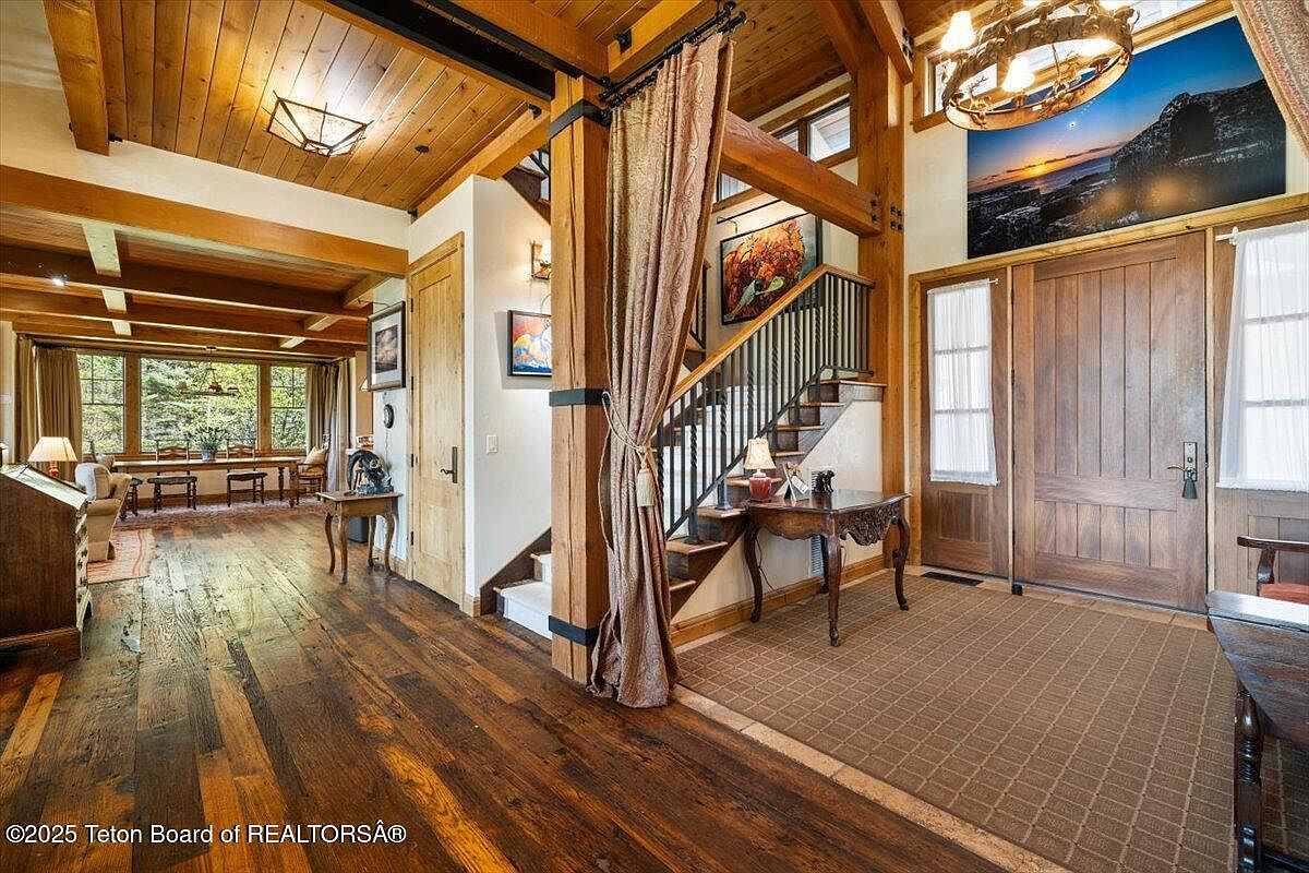 The entryway exudes a warm, inviting ambiance with rich wood tones and rustic charm. Beamed ceilings and polished hardwood floors create a seamless connection between areas. A large, double-door entrance welcomes guests, enhanced by natural light filtering through strategically placed windows. To the left, a cozy seating area framed by soft drapes invites relaxation, while an elegant table sets the stage for decorative accents. The staircase, featuring dark wooden steps and wrought iron railings, leads to upper levels. Artistic touches, from framed artworks to a beautiful chandelier, enhance the space’s aesthetic, making it both family-friendly and visually striking.
