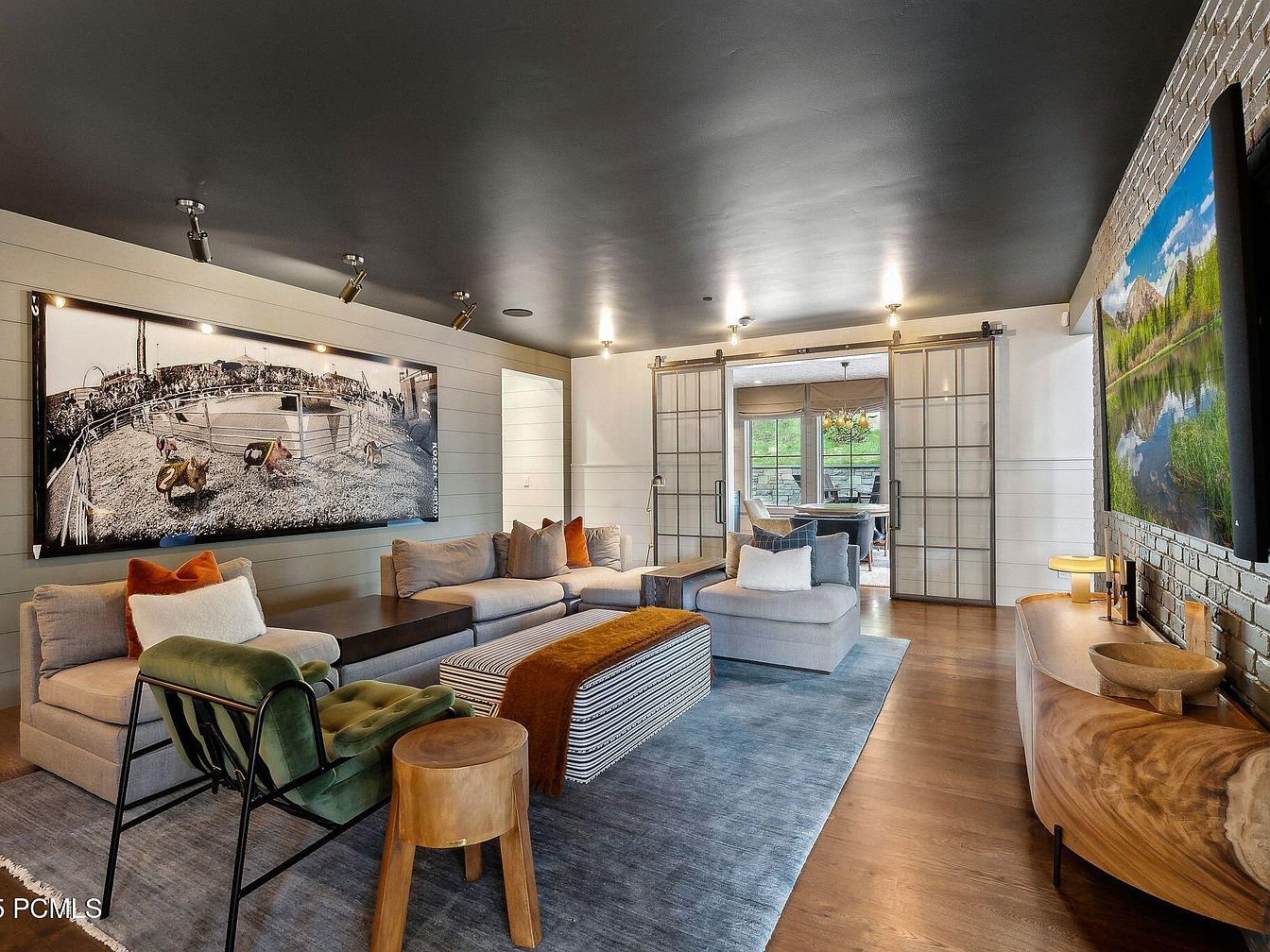 This inviting living room combines contemporary design with comfortable elegance. A plush sectional sofa adorned with accent pillows in warm tones creates a cozy seating area, while a statement artwork graces the feature wall, adding a touch of personality. Natural light streams through sliding glass doors, connecting the space to the outdoor views. A chic rug grounds the room, harmonizing with the rich wooden flooring. Sleek architectural details like a stone accent wall complement the modern vibe. Family-friendly furnishings, including a vibrant green chair and textured poufs, enhance the room’s functionality, making it perfect for relaxation and gatherings.