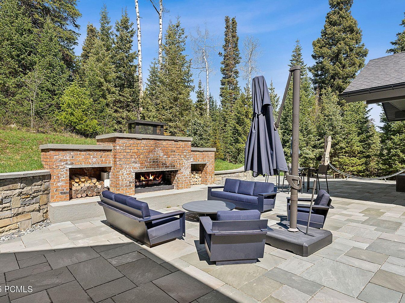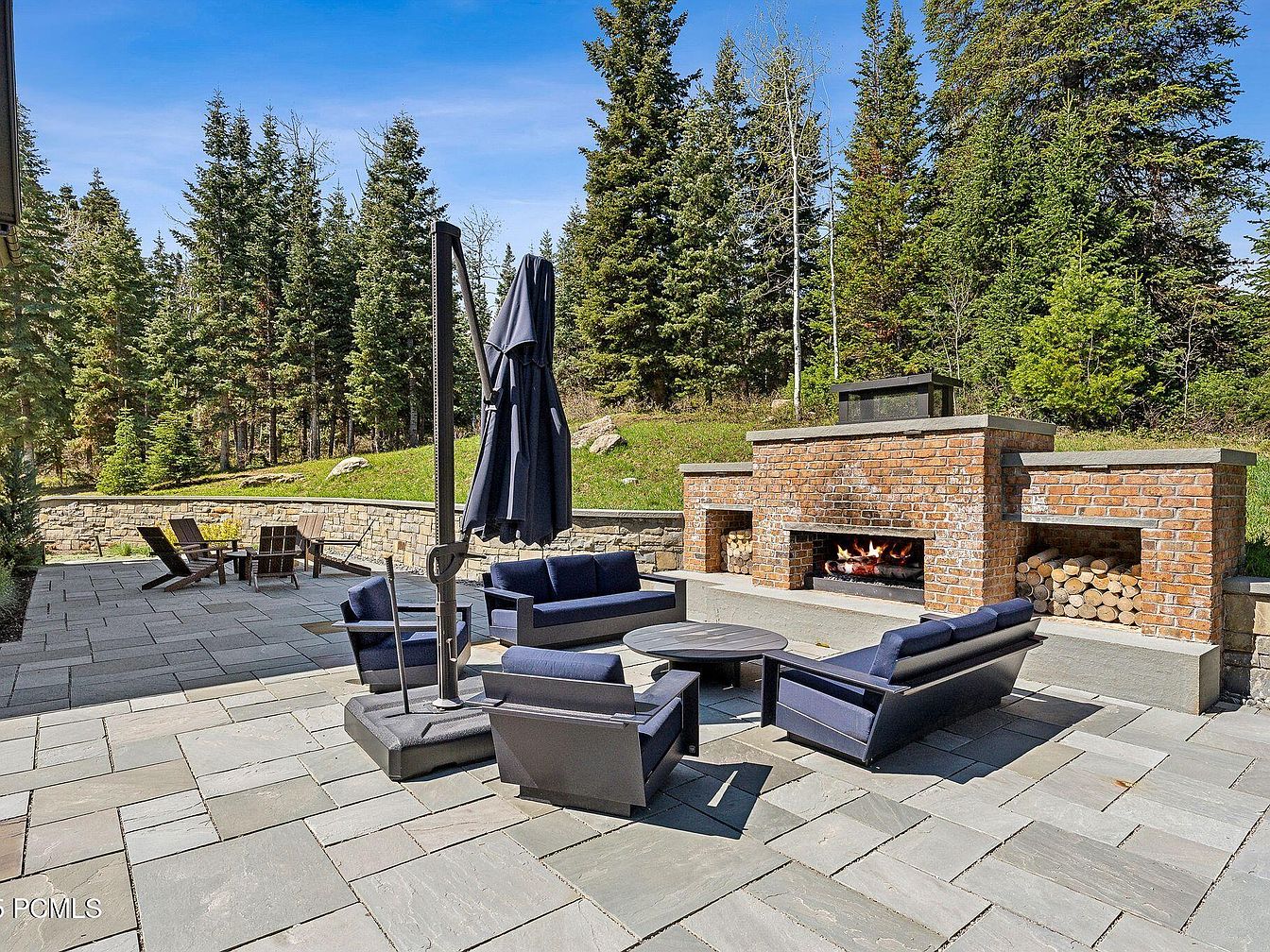 This inviting outdoor living space features a stylish seating arrangement with deep blue cushions and modern, sleek furniture. A spacious stone patio surrounds a beautifully crafted outdoor fireplace, perfect for gatherings or cozy evenings. The rustic charm of the brick fireplace harmonizes with neatly stacked firewood, adding warmth to the ambiance. The layout encourages family interaction, with ample seating and proximity to nature, surrounded by lush evergreens. An umbrella provides shade during sunny days. This space offers a perfect blend of comfort and style, ideal for entertaining or enjoying quiet moments in a picturesque setting.