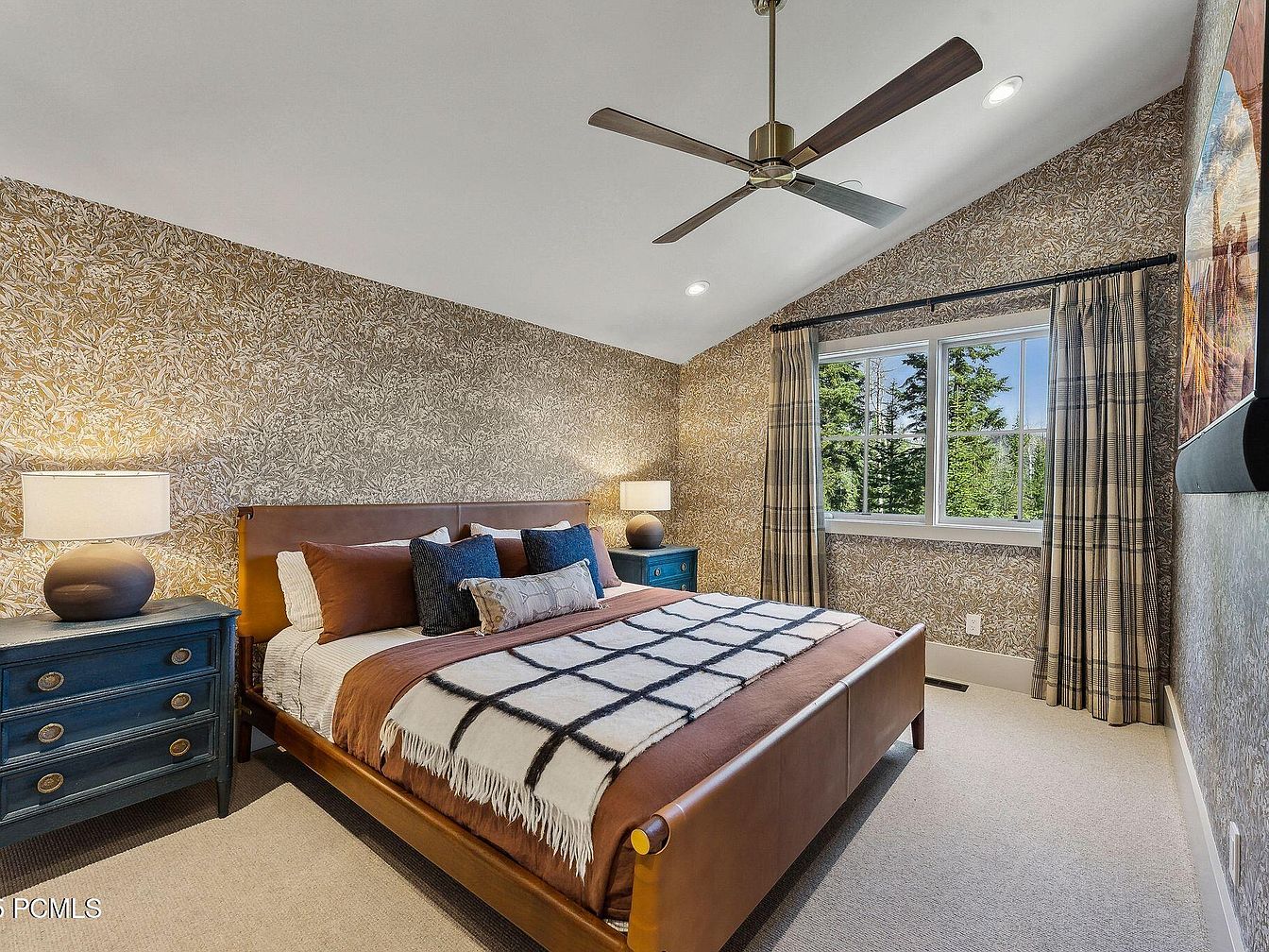 This cozy master bedroom features a harmonious blend of modern design and warm elegance. The vaulted ceiling enhances the spacious feel, while the rich, nature-inspired wallpaper creates an inviting backdrop. A plush king-sized bed adorned with a mix of textured pillows and a soft throw blanket invites relaxation. Beside it, a statement blue nightstand adds a pop of color, complemented by stylish table lamps. Large windows framed with plaid curtains provide ample natural light and scenic views of the outdoors. Neutrals dominate the color palette, with earthy tones that promote tranquility, making this space perfect for restful nights.