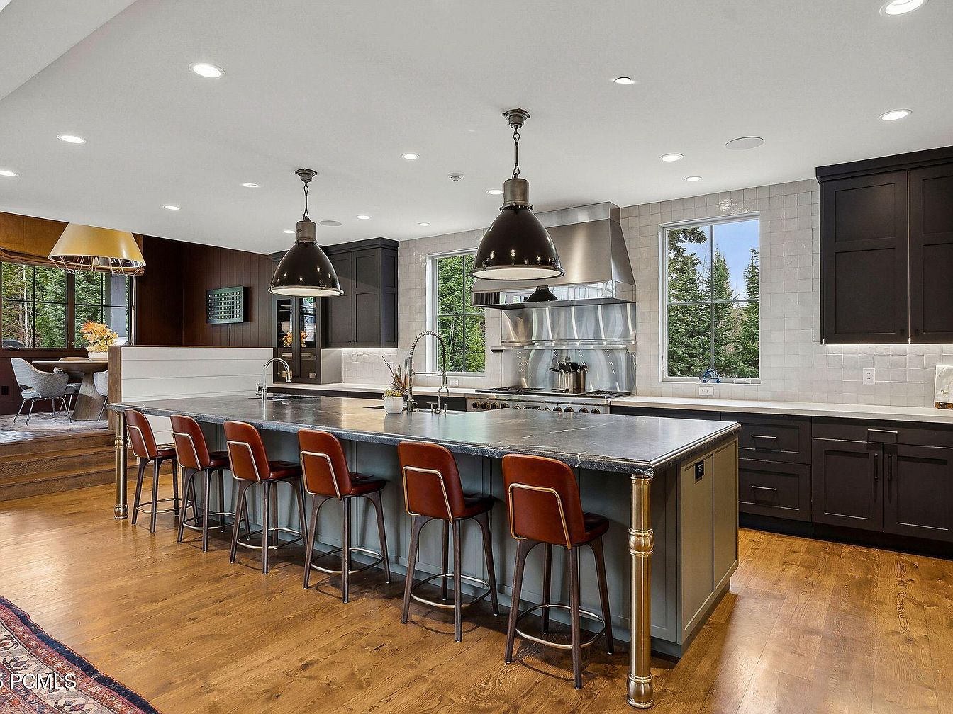 This modern kitchen features a spacious island with a sleek metal countertop, surrounded by stylish leather barstools that invite family gatherings. The blend of dark cabinetry and warm wood accents creates a cozy yet elegant atmosphere. Ample natural light streams through large windows, framing serene outdoor views and enhancing the inviting ambiance. Sleek stainless steel appliances offer both functionality and a contemporary aesthetic. Thoughtful architectural details, like the unique pendant lights and rich textures, add character to the space. The layout encourages easy movement, making it an ideal hub for culinary creativity and family interaction.