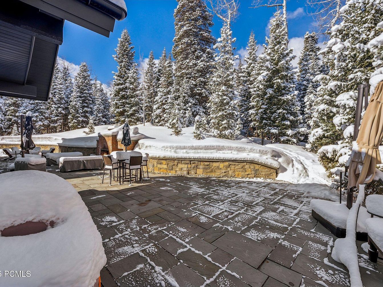 This inviting winter patio combines the warmth of stone with the charm of snow-covered trees. The expansive stone patio, laid out in a timeless pattern, provides ample space for outdoor gatherings. Cozy seating areas, featuring plush cushions, invite relaxation while overlooking the stunning snowy landscape. A stylish outdoor fireplace, surrounded by a sweeping stone wall, creates a perfect focal point for chilly evenings. Modern umbrellas offer shade during sunny days, enhancing versatility. The color palette of natural stone and soft, earthy tones harmonizes with the surrounding nature, crafting a serene escape for family and friends to enjoy year-round.