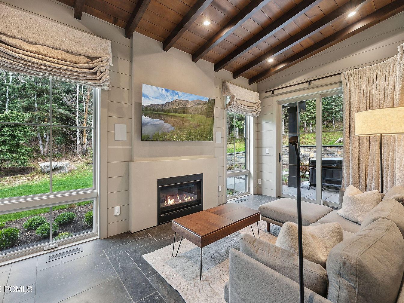 This inviting living room features a warm color palette, accentuated by natural tones and textures. High, vaulted ceilings with exposed wooden beams create an open and airy feel, while soft gray walls bring a touch of elegance. A modern gas fireplace serves as the focal point, surrounded by sleek stone detailing, perfect for cozy gatherings. Large windows frame views of the lush greenery outside, enhancing the room’s natural light. Plush sofas and a chic coffee table provide a family-friendly layout, while soft area rugs add comfort underfoot. Thoughtful decor elements ensure a space that balances style and warmth.