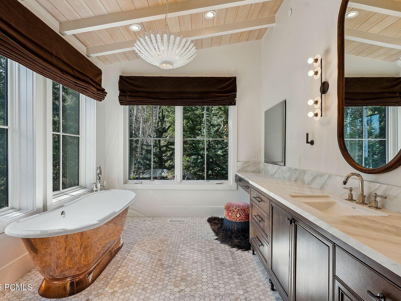 This stunning bathroom combines modern luxury with rustic charm, featuring a beautifully freestanding tub with a rich wooden base that harmonizes with the elegant marble countertop. The design incorporates a warm color palette of soft whites and earthy browns, complemented by honey-hued wooden beams overhead and elegant natural light flooding through expansive windows. A double sink setup offers convenience, while stylish light fixtures and a large, round mirror enhance the sophistication. Family-friendly features such as strategically placed plush seating provide comfort and relaxation. Polished hexagonal tile flooring adds a timeless touch, making this space a perfect oasis for rejuvenation.