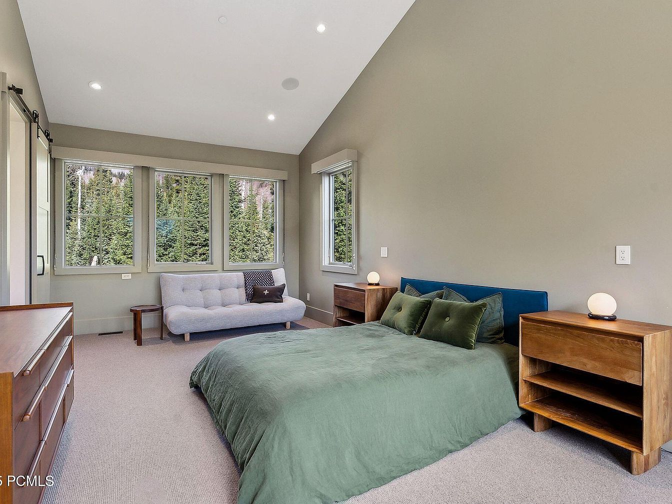 This serene master bedroom features a spacious layout with large windows providing stunning views of lush greenery. The gentle light gray walls complement the earthy tones of the plush green bedding, creating a calming atmosphere. A cozy, modern sofa invites relaxation, while wooden nightstands add warmth and practicality. The room boasts high ceilings with recessed lighting, enhancing the spaciousness. Family-friendly elements are evident, with ample floor space for movement and a soft carpet underfoot. Stylish decorative pillows adorn the bed, marrying comfort with contemporary style, making this space ideal for unwinding after a long day.