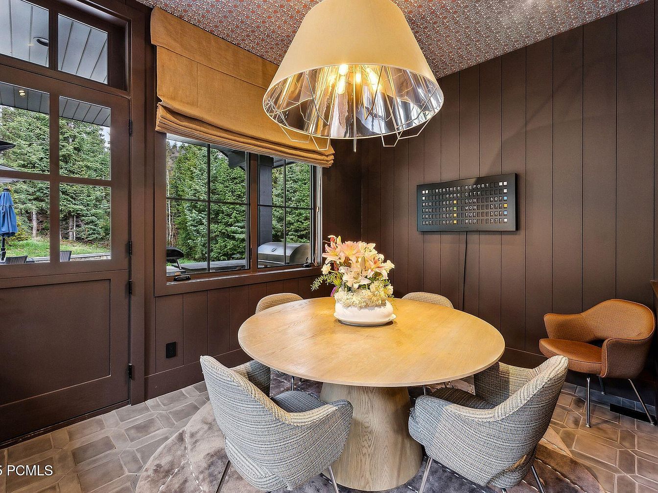 This inviting dining area features a round wooden table at its center, surrounded by plush, contemporary chairs that provide a cozy atmosphere for family gatherings. Dark wood paneling on the walls enhances the warmth, while large windows invite natural light and offer soothing views of the lush greenery outside. The distinctive pendant light overhead adds a modern touch with its unique metallic design, providing both style and functionality. Beige accents in the window treatments complement the color scheme, creating a harmonious blend of nature and modern design. Ideal for intimate dining experiences or lively family meals.