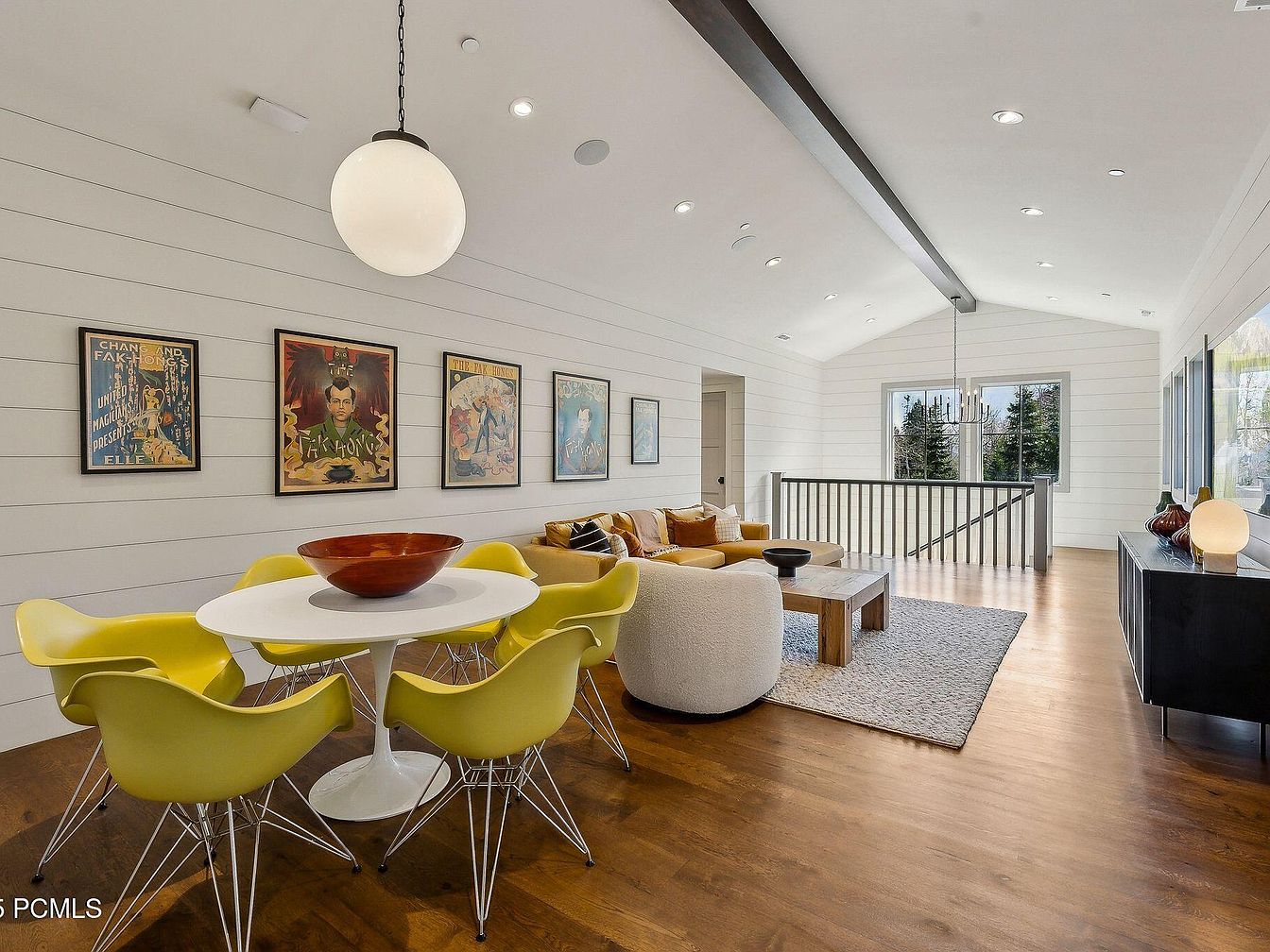 This contemporary living room boasts an open layout, seamlessly blending elegance with comfort. The crisp white shiplap walls enhance the airy feel, accentuated by a vaulted ceiling with exposed wooden beams. A round white dining table surrounded by vibrant yellow chairs offers a playful touch, perfect for family gatherings. Rich wood flooring warms the space, complemented by a soft area rug beneath a cozy sectional sofa adorned with colorful throw pillows. The room features captivating artwork, adding personality, while large windows frame picturesque views, inviting natural light. Modern fixtures and sleek furniture create a stylish yet welcoming ambiance.