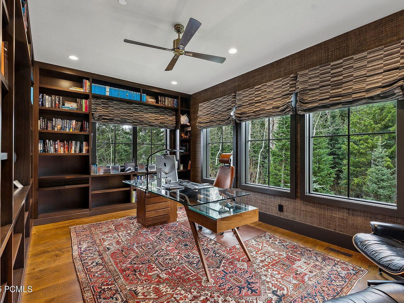 This sophisticated home office features a stunning layout that blends functionality with aesthetic appeal. Large windows provide abundant natural light, framing views of lush greenery outside. The rich wooden bookshelves add warmth, showcasing an extensive collection of books and decorative items. A contemporary glass desk stands at the center, complemented by a stylish leather executive chair, ideal for both work and comfort. The space is anchored by an ornate area rug that introduces vibrant colors and texture. With its sleek ceiling fan and tasteful window treatments, this room perfectly balances modern design with a cozy, inviting atmosphere.