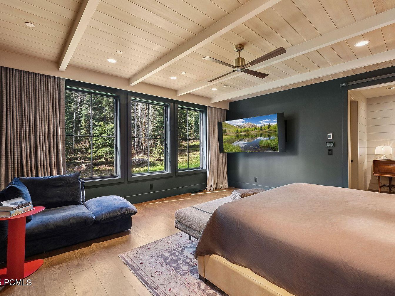 This spacious master bedroom combines modern elegance with cozy comfort. A stylish dark accent wall contrasts beautifully with the light wood ceiling and natural light streaming through expansive windows, framing serene outdoor views. The inviting layout features a plush king-size bed, complemented by soft bedding in muted tones. An elegant blue sofa provides a perfect lounging space, paired with a vibrant red side table for a pop of color. Thoughtfully designed elements like recessed lighting and a ceiling fan enhance functionality, while a mounted TV adds entertainment options. Ideal for relaxation, this room emphasizes both style and tranquility.