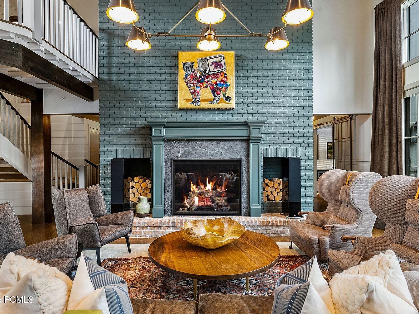 This inviting living room features a stunning focal point with its dual-tone brick fireplace, accented by a tasteful blend of vibrant art and soft furnishings. The space showcases a harmonious blend of texture and warmth, from the smooth, earthy tones of the brick to the plush, asymmetrical seating that encourages relaxation. Architectural elements like the high ceiling with contemporary lighting contrast beautifully against wooden beams, enhancing the rustic feel. Sunlight filters through large windows, illuminating a richly patterned area rug underneath a round, warm wood coffee table, creating an inspiring environment perfect for family gatherings and cozy evenings.