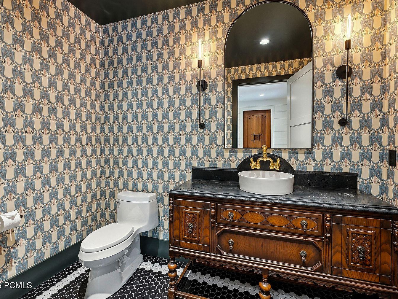 This beautifully designed bathroom showcases a fusion of vintage and modern aesthetics. The standout feature is the intricately patterned wallpaper, adorned with stylish illustrations in muted tones, which creates an inviting, artistic atmosphere. A luxurious, dark marble countertop complements the antique-style wooden vanity, offering ample storage with its ornate detailing. The sleek, vessel sink sits atop, paired elegantly with an eye-catching gold faucet, adding a touch of glamour. Black hexagonal tiles on the floor enhance the space’s chic elegance, while wall sconces provide warm lighting, perfect for a cozy family-friendly environment. The spacious layout encourages a relaxing experience.