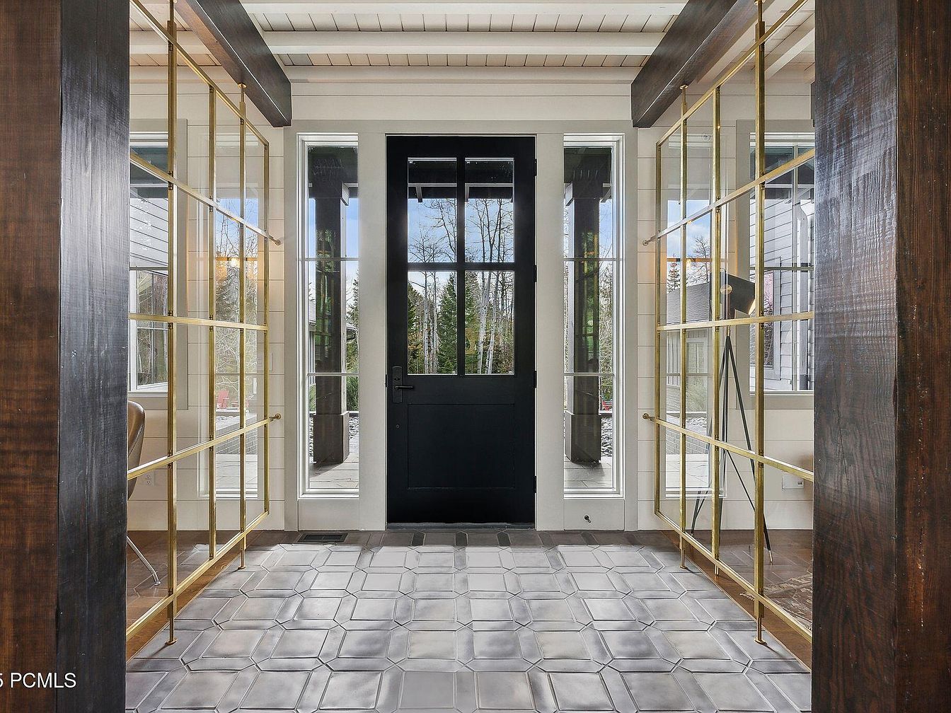 The entryway features a striking black door framed by expansive windows that invite natural light, creating a warm welcome. Flanking the door are elegant gold-accented glass bookcases, offering both style and functionality, perfect for displaying décor or family photos. The space boasts a blend of modern and rustic elements with its textured floor tiles in muted earth tones, providing durability and aesthetic appeal. The white-paneled walls and ceiling enhance a fresh, airy feel, while dark wooden accents bring depth. This inviting entrance harmonizes sophisticated design with family-friendly practicality, setting a charming tone for the home.