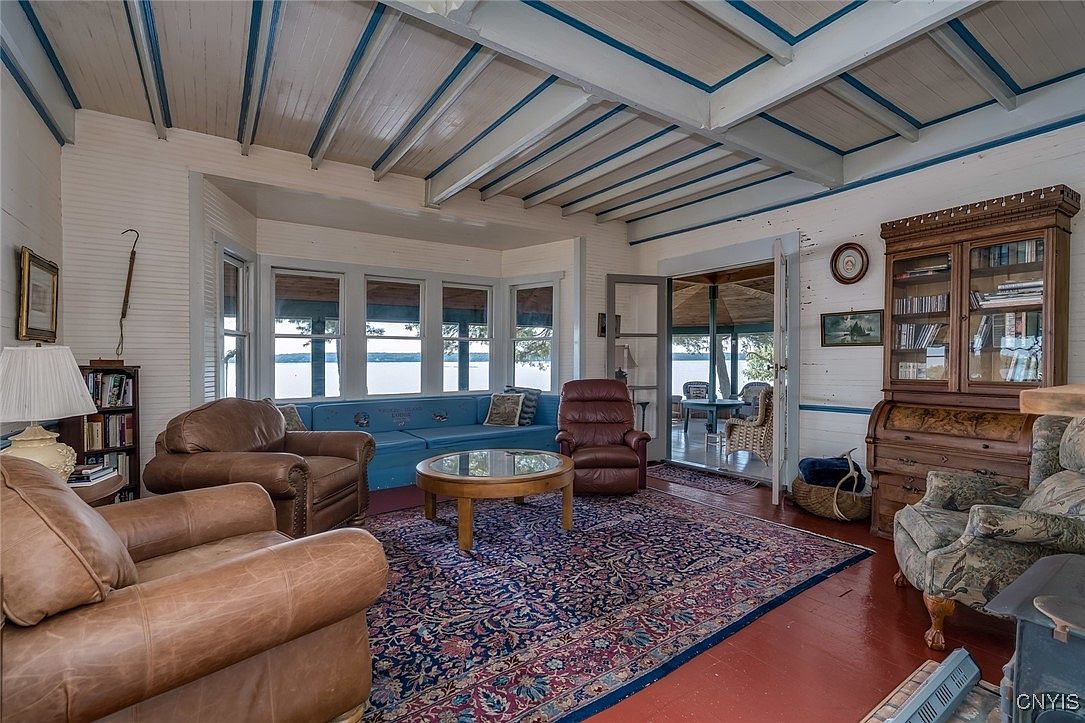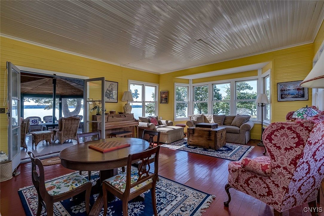 Bright and inviting, the living room’s generous bay windows frame serene lake views, filling the space with natural light. Cheerful yellow walls are paired with rich red-toned wood floors, creating a cozy and energetic atmosphere. Comfortable seating includes a plush sofa and armchairs, complemented by a unique wooden chest serving as a coffee table. Family-friendly features abound: an upright piano invites music, a game table encourages togetherness, and durable area rugs define spaces for relaxation or play. Thoughtful decor and vintage-style furnishings enhance the welcoming, lived-in charm while French doors open to a shaded porch, blending indoor comfort with stunning outdoor scenery.