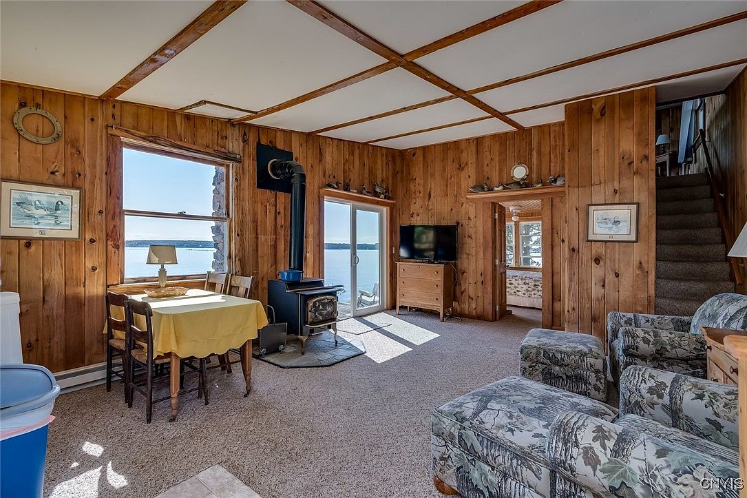 This cozy living room features warm, rustic wood paneling and large windows showcasing expansive lake views, perfect for family gatherings and relaxation. The open layout includes a small dining area with a table draped in a cheerful yellow cloth, inviting home-cooked meals by the water. A wood-burning stove sits at the heart of the space, adding both charm and heat for colder days. Soft carpeting provides comfort underfoot, while cushioned armchairs in nature-inspired fabric offer plenty of seating. Sliding glass doors connect the room directly to the outdoors, fostering a seamless connection to nature for families to enjoy year-round.
