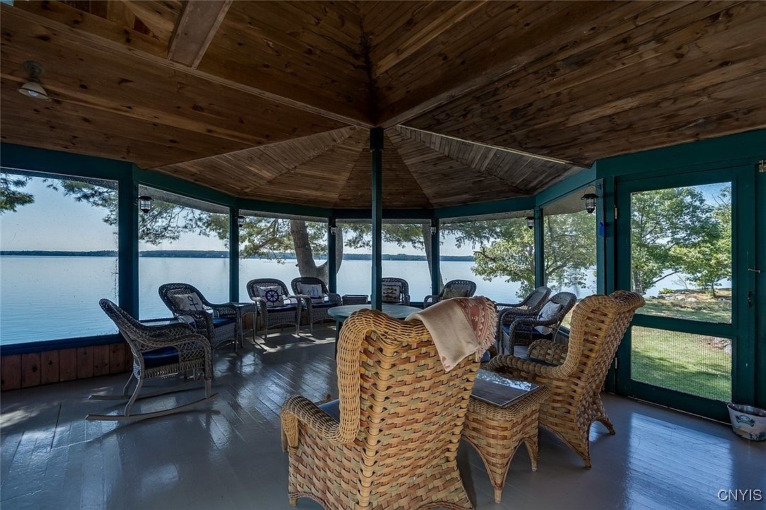 A spacious enclosed sunroom with panoramic lake views creates a tranquil gathering space perfect for family and friends. Multiple wicker chairs and rocking armchairs are arranged in a circular layout to encourage conversation and relaxation. The vaulted, natural wood ceiling adds warmth and rustic charm, complementing the painted wood flooring and deep teal trim. Tall screened windows from floor to ceiling bathe the room in natural light and allow for summer breezes without worrying about bugs, making the space family-friendly and comfortable for all ages. This sunroom is ideal for leisurely mornings, cozy afternoons, and sunset evenings by the water.