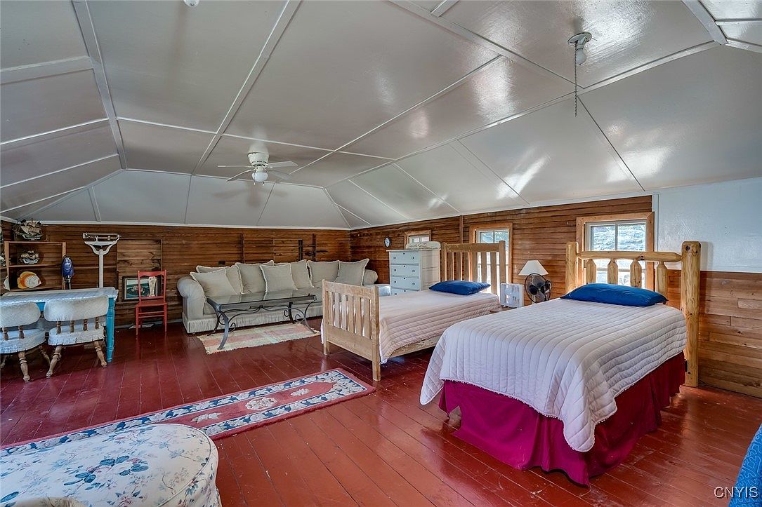 This airy loft bedroom features two rustic wooden beds with crisp white quilts and navy accents, ideal for siblings or guests. The space is inviting and family-friendly, with a plush neutral sofa and a glass-topped coffee table separating the sleeping area from a cozy seating nook. Warm wood-paneled walls and a bold red-painted floor create a cabin-inspired charm, while multiple windows allow natural light to brighten the room. Thoughtful touches include a white dresser, table lamps, and a floral ottoman, blending comfort and functionality. The ceiling fan ensures comfort, making this room perfect for relaxation and family gatherings.