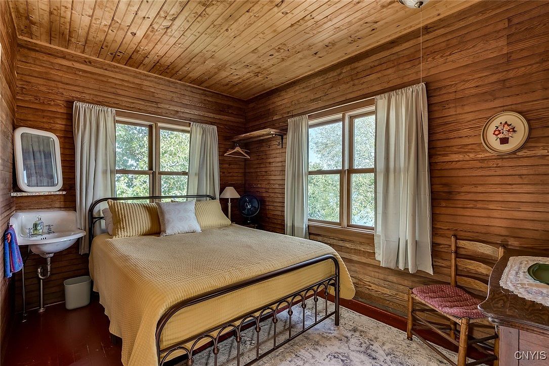 A serene bedroom boasts rustic charm with its warm wooden walls and ceiling, creating a cabin-like ambiance perfect for relaxation. Natural light streams through multiple double-hung windows dressed in soft cream curtains, brightening the room and highlighting the inviting bed dressed in a cheerful yellow coverlet and accent pillows. Family-friendly features include easy-to-clean wood surfaces, a vintage in-room washbasin for convenience, and practical storage with open shelving. The space is thoughtfully furnished with a simple wooden chair, a bedside lamp, and a small table, making this a comfortable and welcoming retreat suitable for both adults and children.