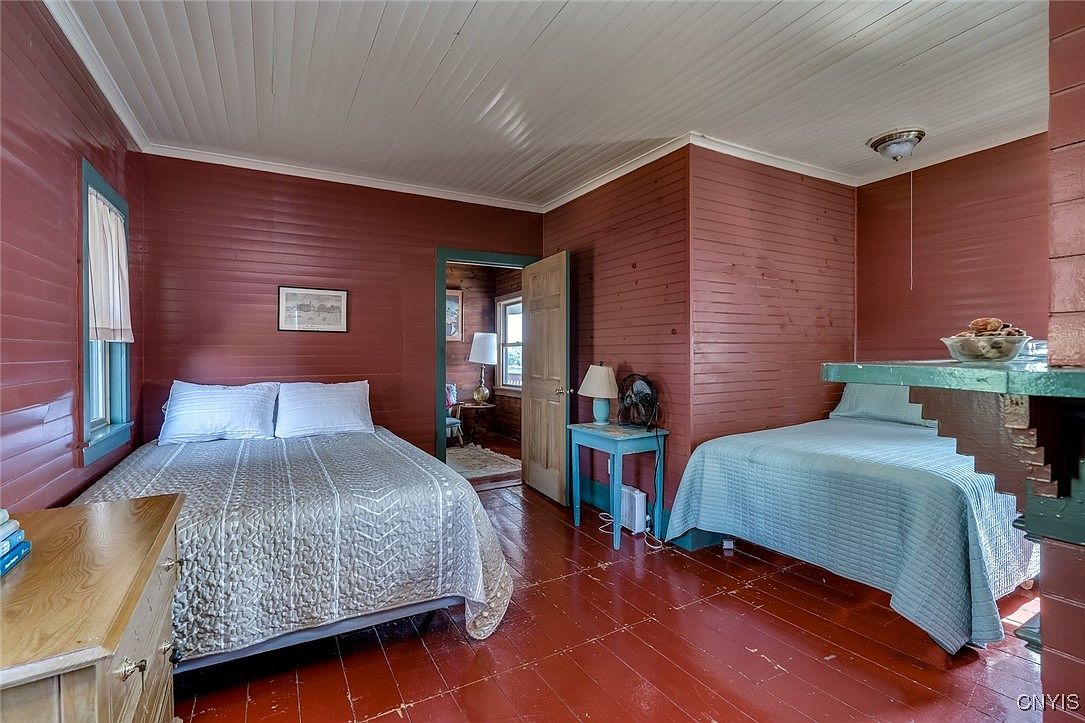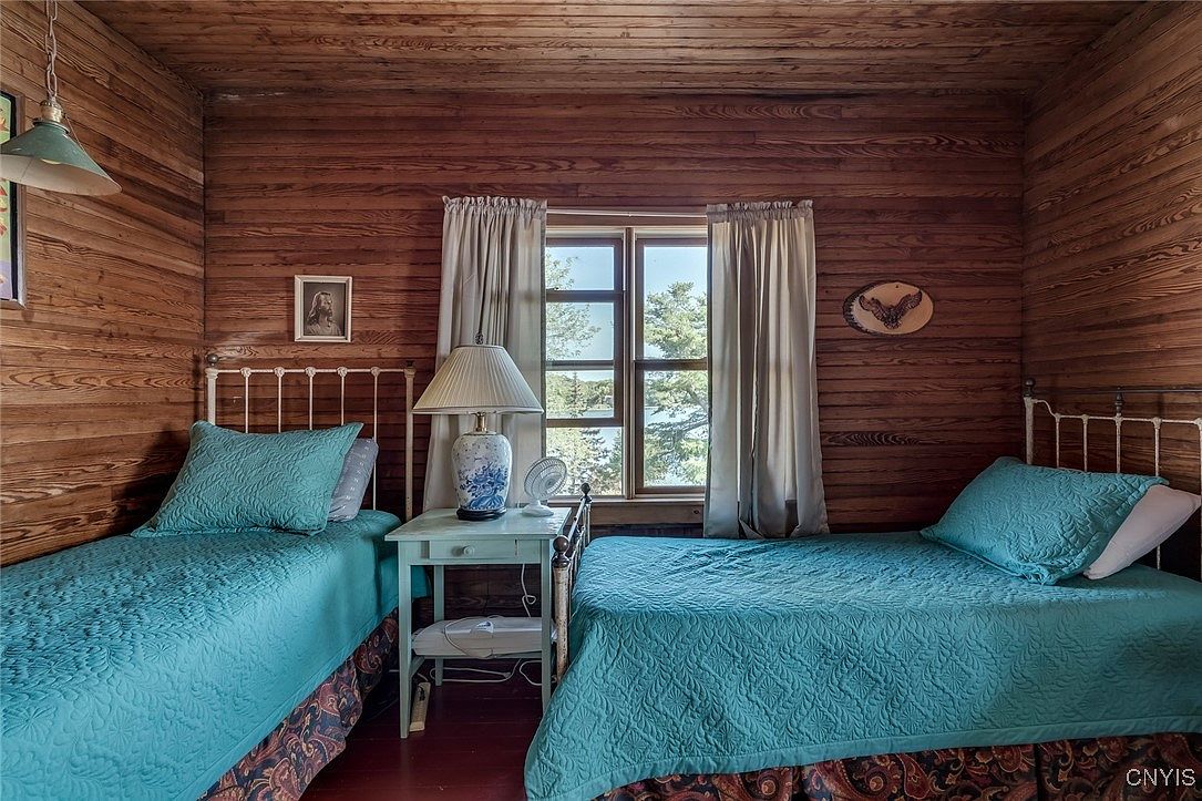 A spacious bedroom showcases rustic charm with its all-wood walls and ceiling, creating a warm, inviting atmosphere perfect for family living. Large windows offer an uninterrupted view of the lake, filling the room with natural light and providing a serene backdrop. The iron-framed bed is dressed in a deep blue quilt, complementing the blue and white area rug that anchors the space. A brick fireplace adds a cozy focal point, while classic furnishings such as a writing desk and cushioned chair enhance comfort. The neutral, earthy palette and thoughtful arrangement make this bedroom both peaceful and practical for all ages.