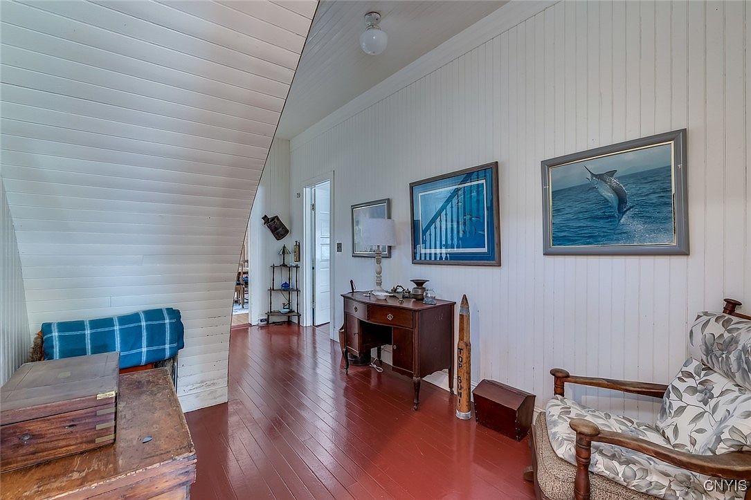A bright, welcoming upstairs hallway nook features crisp white shiplap walls and ceiling, contrasted by deep red painted hardwood floors for a charming, farmhouse feel. The space is decorated with nautical artwork and vintage touches, including a sleek wooden writing desk, a cozy upholstered armchair, and a rustic storage trunk. Natural light illuminates the hallway, making it both functional and inviting for families. The open layout provides space for reading, relaxing, or gathering, while accessible doorways lead to adjoining rooms, enhancing connectivity. The blue plaid throw and subtle accessories add warmth and character perfect for an inspiring home environment.