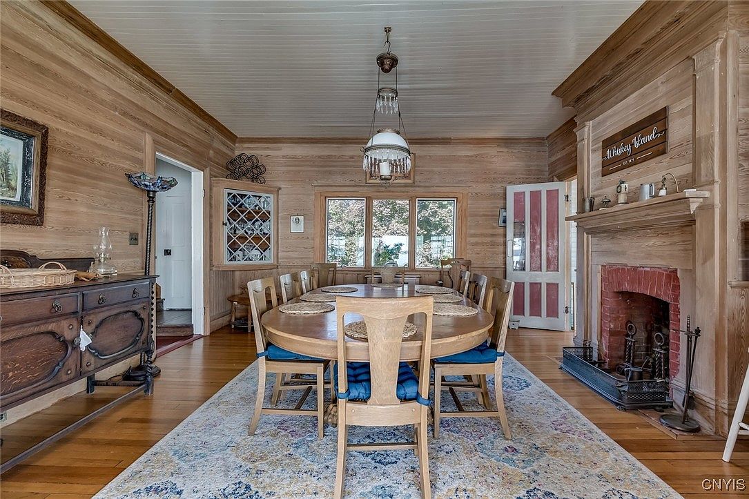 A warm, rustic dining room invites family and friends to gather around a large oval wooden table flanked by matching chairs with navy-blue cushions for added comfort. The room features soft-toned wood paneling on the walls and ceiling, with a beautiful fireplace accented by red brick and a carved mantel adding character. Natural light floods in through a set of three windows, giving the room an airy, welcoming feel. An ornate sideboard and built-in china display add both convenience and traditional charm, while a neutral area rug grounds the space and softens the natural wood flooring for a cozy, family-friendly ambiance.