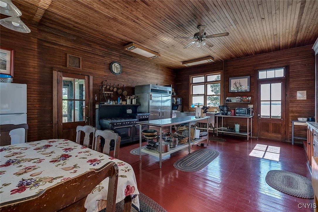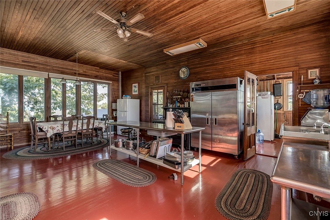 This warm, inviting kitchen and dining area features wood-paneled walls and ceiling that exude rustic charm, complemented by polished red floors that provide a lively contrast. Large windows line one side of the room, bathing the space in natural light and offering serene views, perfect for family gatherings at the cozy dining table adorned with a floral tablecloth. The kitchen is practical and family-friendly, equipped with ample stainless-steel appliances, generous countertop workspace, and an island for food preparation. Subtle details like braided rugs, wooden chairs, and open shelving add to the ambiance, making it a true heart of the home.