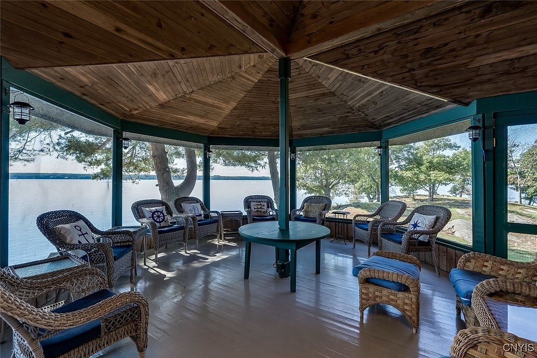 A welcoming screened porch offers panoramic views of the tranquil waterfront, making it ideal for gatherings or peaceful relaxation. The octagonal layout is enhanced by a warm, natural wood ceiling and sturdy teal-painted beams, creating a rustic yet cozy atmosphere. Wicker armchairs with deep blue cushions and nautical-themed pillows invite family and friends to settle in for conversation or games, with a central round table perfect for snacks or board games. Ample seating and wide, open sightlines make this space family friendly, while the blend of natural light and lake breezes ensures comfort for all ages.