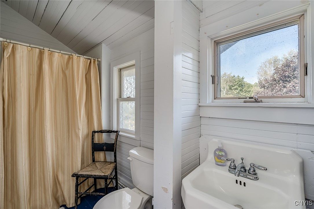 This bathroom blends classic charm with functional design, making it ideal for family living. Soft white tongue-and-groove walls and ceiling create a bright, airy feel, complemented by abundant natural light from two well-placed windows. A simple cream shower curtain and vintage wooden chair add character, while the pedestal sink and standard toilet keep the layout practical and space-efficient. The crisp white palette enhances cleanliness and offers flexibility for personal touches. With its durable surfaces, easy-care finishes, and a cozy layout, this bathroom provides a welcoming retreat for both kids and adults to enjoy daily routines comfortably.