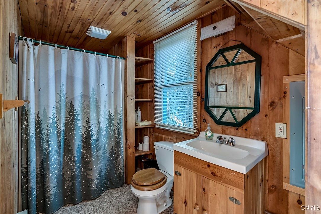 A cozy bathroom features all-over knotty pine paneling for a warm, cabin-like atmosphere. Natural wood covers the walls, ceiling, vanity, and even the toilet seat, creating a cohesive rustic look. Sunlight pours through a large window with classic blinds, keeping the space bright and inviting. Forest-themed shower curtains add a playful, family-friendly touch. Open shelving provides practical storage for towels and essentials, ideal for busy households. An octagonal mirror with a dark wooden frame introduces geometric interest and complements the natural finishes. The earthy tones and thoughtful layout blend functionality with charming mountain lodge style.