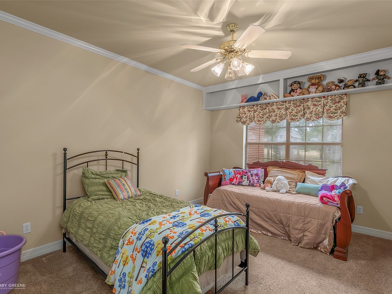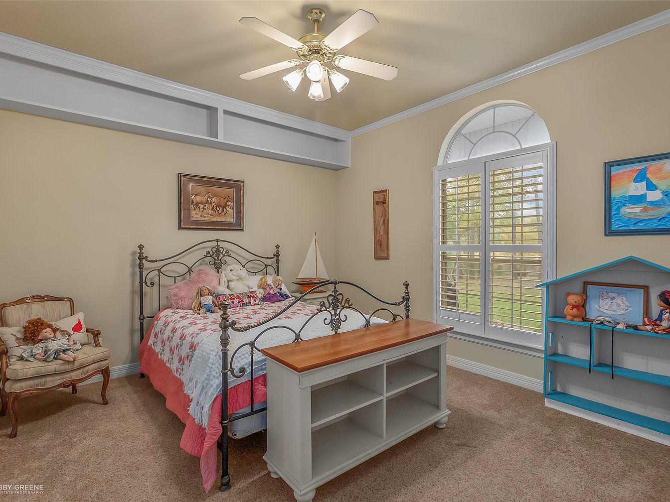 This inviting kid’s bedroom features a charming blend of comfort and joy, perfect for a child’s retreat. The room is adorned with warm beige walls and plush carpeting, creating a cozy and welcoming atmosphere. A decorative iron bed with a vibrant patchwork quilt lies at the center, accompanied by stuffed toys that add whimsy. A small bookshelf in playful blue houses toys and books, while a cozy chair offers a spot for reading. Natural light floods the room through plantation shutters on a large window, enhancing the cheerful ambiance. Thoughtful details like artwork and playful accents make this space both functional and delightful.