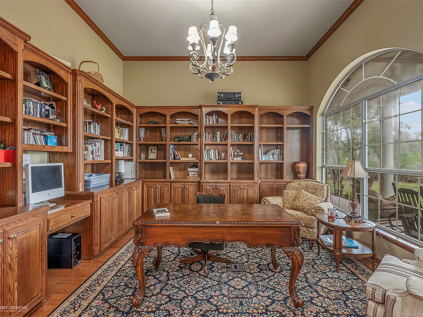 This inviting home office showcases an elegant blend of functionality and warmth. Rich wooden shelving lines the walls, providing ample storage for books and personal items, while a classic oak desk takes center stage, featuring intricate carvings and a polished finish. Soft lighting from a chandelier enhances the cozy atmosphere, complemented by a plush armchair adorned with a floral pattern, perfect for relaxation. The color palette includes warm earth tones, creating a serene work environment. Expansive windows invite natural light, connecting the space to the outdoor views, making it an inspiring place for productivity and creativity.