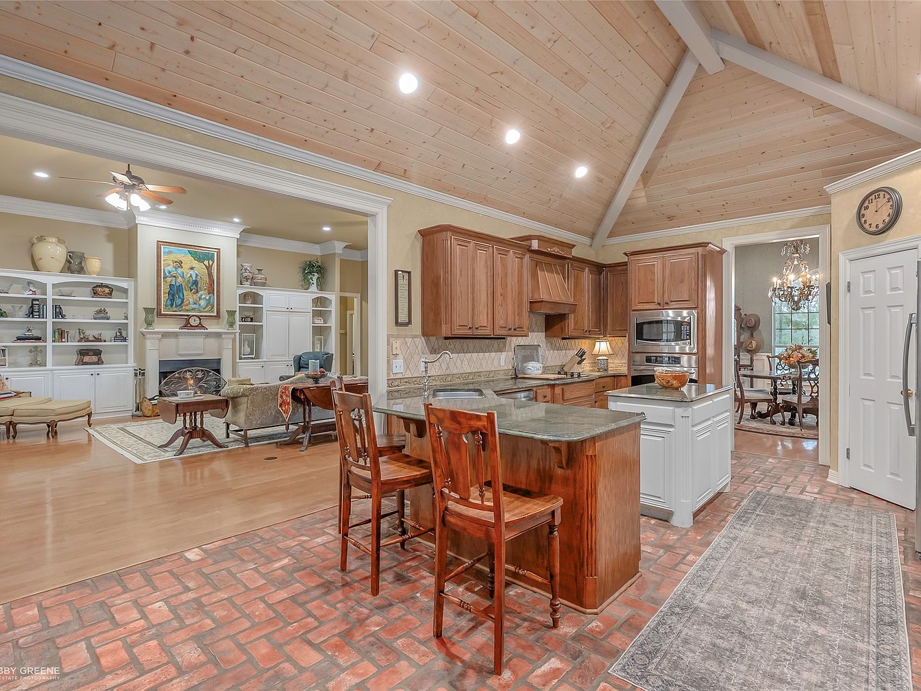 This inviting open-concept kitchen seamlessly integrates with the living area, showcasing a stunning combination of rustic charm and modern comfort. The high, vaulted ceiling adorned with wooden beams enhances the spacious feel, while warm, rich cabinetry contrasts beautifully with the light granite countertops. The cozy brick flooring adds a touch of warmth, ideal for a family-friendly environment. Bar stools invite casual dining at the large kitchen island, while an adjacent dining area, illuminated by elegant chandelier lighting, sets the stage for family gatherings. Decorative shelves and tasteful artwork complete the inviting atmosphere, creating a perfect heart for any home.