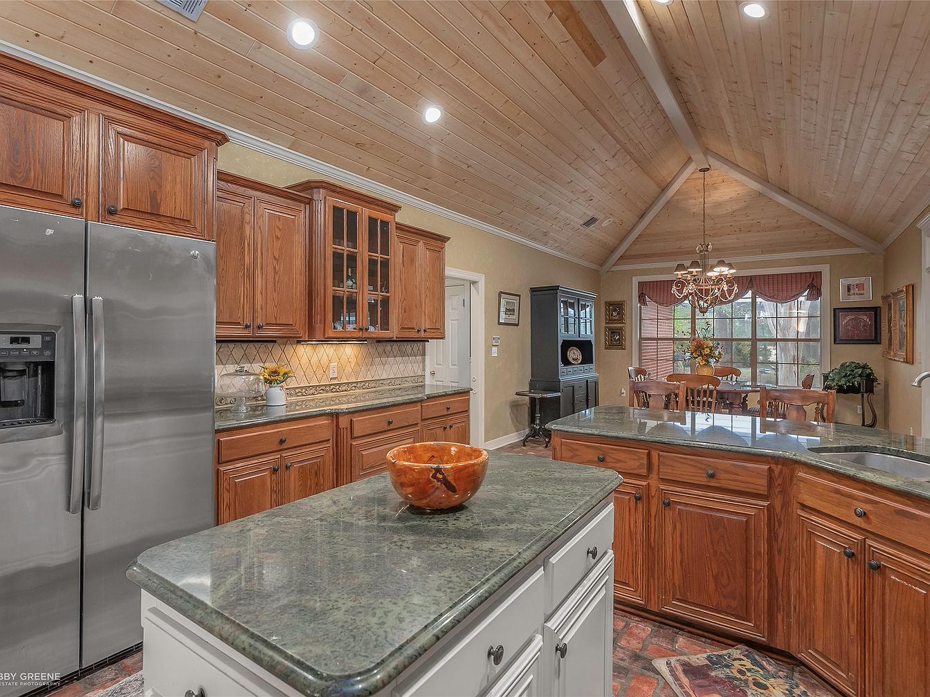 This inviting kitchen features a spacious layout with a stunning vaulted ceiling, creating an open and airy atmosphere. Rich, warm wood cabinetry complements sleek stainless steel appliances, seamlessly blending modern convenience with traditional charm. A large, green stone island serves as a focal point, perfect for family gatherings or casual dining. The creamy-toned walls enhance the cozy feel, while decorative accents and tasteful artwork add personality. Natural light floods the space from generous windows, creating an organic connection to the outdoor surroundings. The adjacent dining area is perfect for family meals, completing this functional and aesthetically pleasing heart of the home.