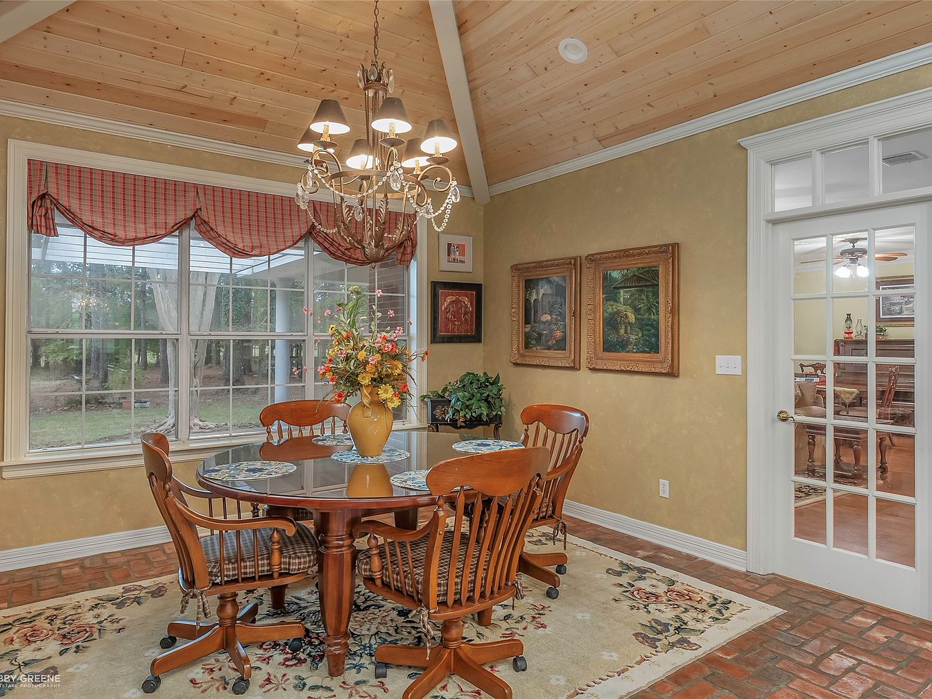 This charming dining room features a circular wooden table surrounded by tasteful spindle-back chairs, offering a cozy spot for family gatherings. The warm color palette, highlighted by soft golden walls and a rich terracotta brick floor, creates a welcoming ambiance. A stunning chandelier hangs gracefully above the table, enhancing the room’s sophistication. Natural light floods in through large windows fitted with plaid valances, revealing a picturesque outdoor view. Decorative artwork adorns the walls, adding character and warmth, while the intricate area rug ties the space together, making it perfect for shared meals and cherished moments.