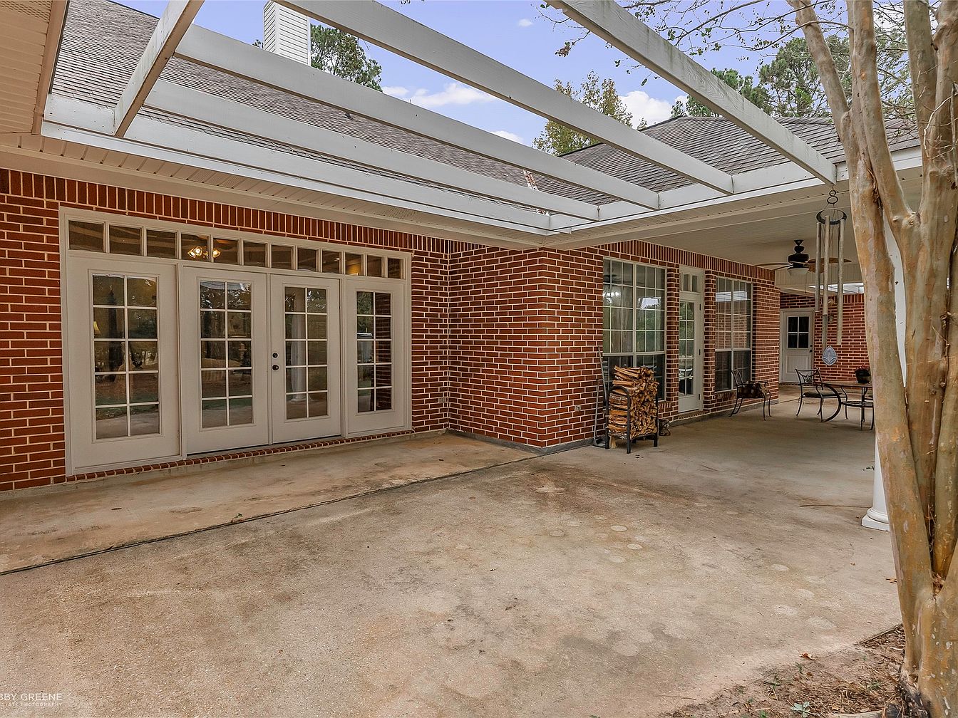 This covered patio seamlessly blends outdoor and indoor living, perfect for family gatherings. Enveloped by classic red brick walls, the space features elegant French doors that invite light and provide easy access to the backyard. The open design incorporates exposed beams overhead, accentuating a spacious feel, while the concrete floor ensures easy maintenance. Comfortable seating arrangements overlook the natural surroundings, creating an inviting atmosphere for relaxation or social events. With its airy ambiance and simple, yet thoughtful architectural details, this patio exemplifies warmth and functionality, making it an ideal retreat for any modern family.