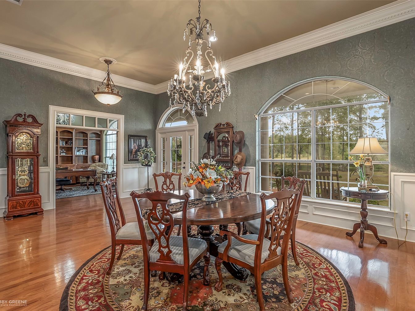This exquisite dining room radiates sophistication and warmth. A circular wooden table, complemented by ornate chairs, invites family gatherings, while the rich cherry tones of the furniture harmonize with the intricate area rug underneath. Elegant wallpaper in soft green offers a refined backdrop, and an eye-catching chandelier adds a touch of glamour. Large arched windows bathe the space in natural light, framing picturesque views of the outdoors. A stylish side table showcases a tasteful lamp and fresh flowers, enhancing the inviting ambiance. Archways connect to a spacious living area, promoting a seamless flow for entertaining.