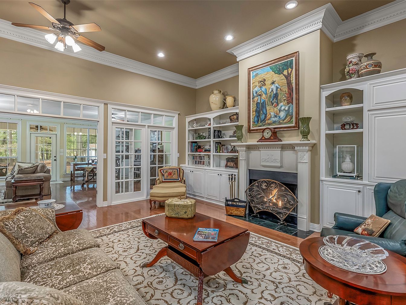Warm and inviting, this spacious living room integrates comfort and style seamlessly. A large, plush sofa adorned with decorative cushions provides an ideal spot for family gatherings. Rich wooden flooring contrasts beautifully with the light beige walls, creating a cozy yet elegant atmosphere. Architectural details such as crown molding and built-in shelves enhance the space, showcasing artisanal decor and books. A prominent fireplace serves as a focal point, flanked by green accent vases. Natural light floods through the large windows and glass doors leading to a serene outdoor area, making this room perfect for both relaxation and entertaining.