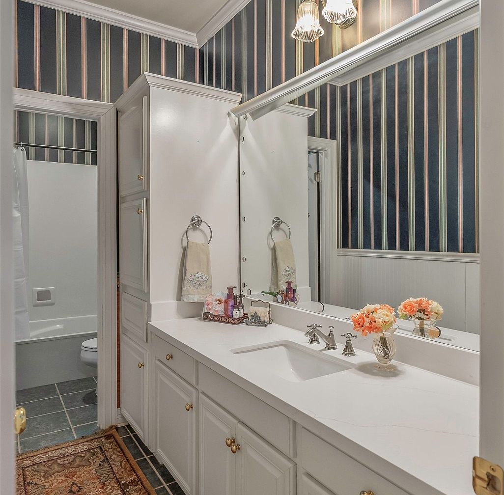 This elegantly designed bathroom features a chic blend of modern functionality and classic styling. The layout includes a spacious white vanity topped with a polished countertop and dual sinks, framed by stylish, decorative lighting. Striped wallpaper adds a touch of sophistication, harmonizing beautifully with the white cabinetry and golden fixtures. A plush area rug enhances the warmth of the space, while fresh floral arrangements introduce a splash of color. The cleverly positioned mirror creates an illusion of expanded space, making it both practical and aesthetically pleasing, perfect for family needs while maintaining an inviting atmosphere.