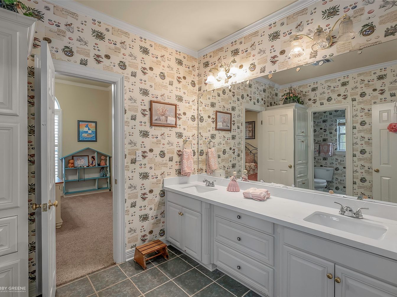 This inviting bathroom features a spacious double vanity with sleek white cabinetry, offering ample storage for family essentials. The soothing color palette includes soft pastels highlighted by a whimsical floral wallpaper, adding a touch of personality. Stylish light fixtures illuminate the marble countertops, enhancing the overall brightness of the room. The ceramic tile floor provides durability while maintaining an elegant appeal. A cozy nook can be spotted through the open doorway, revealing a cheerful play area ready for kids. With thoughtful details throughout, this bathroom is both functional and a delightful retreat for every family member.