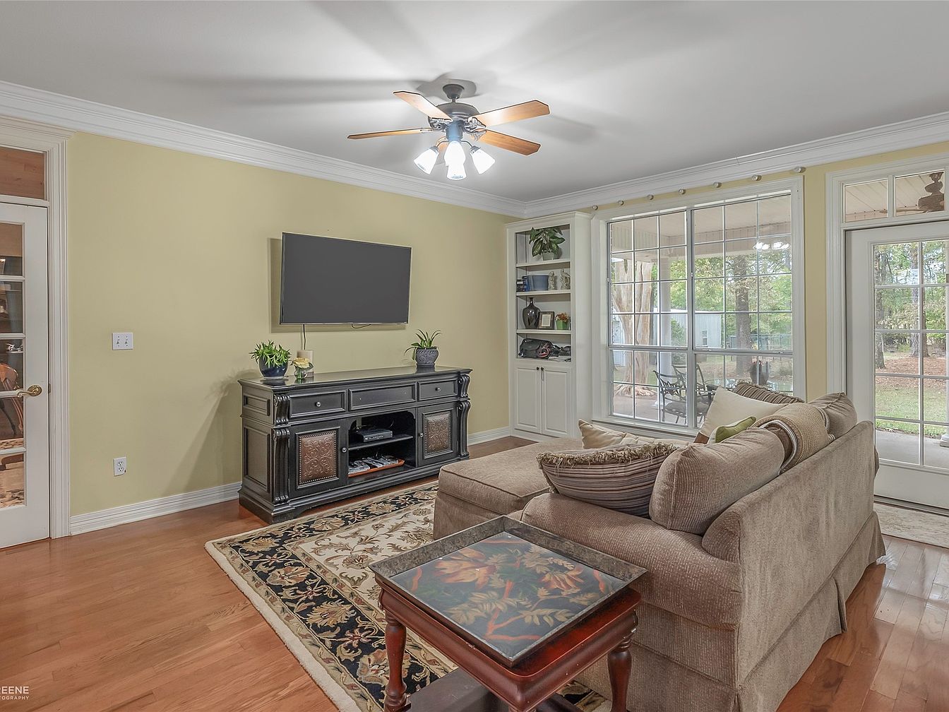 A warm and inviting living room designed for comfort and family gatherings showcases a spacious layout, featuring plush seating with decorative cushions that invite relaxation. The walls are painted a soothing pale yellow, complementing the rich hardwood floors. A classic ceiling fan adds a touch of elegance while ensuring airflow. A stylish entertainment unit houses a flat-screen TV, adorned with potted plants for a touch of greenery. Expansive windows allow natural light to stream in, offering views of the outdoors. Built-in shelves provide functional storage while displaying personal keepsakes, enhancing the overall homely atmosphere.