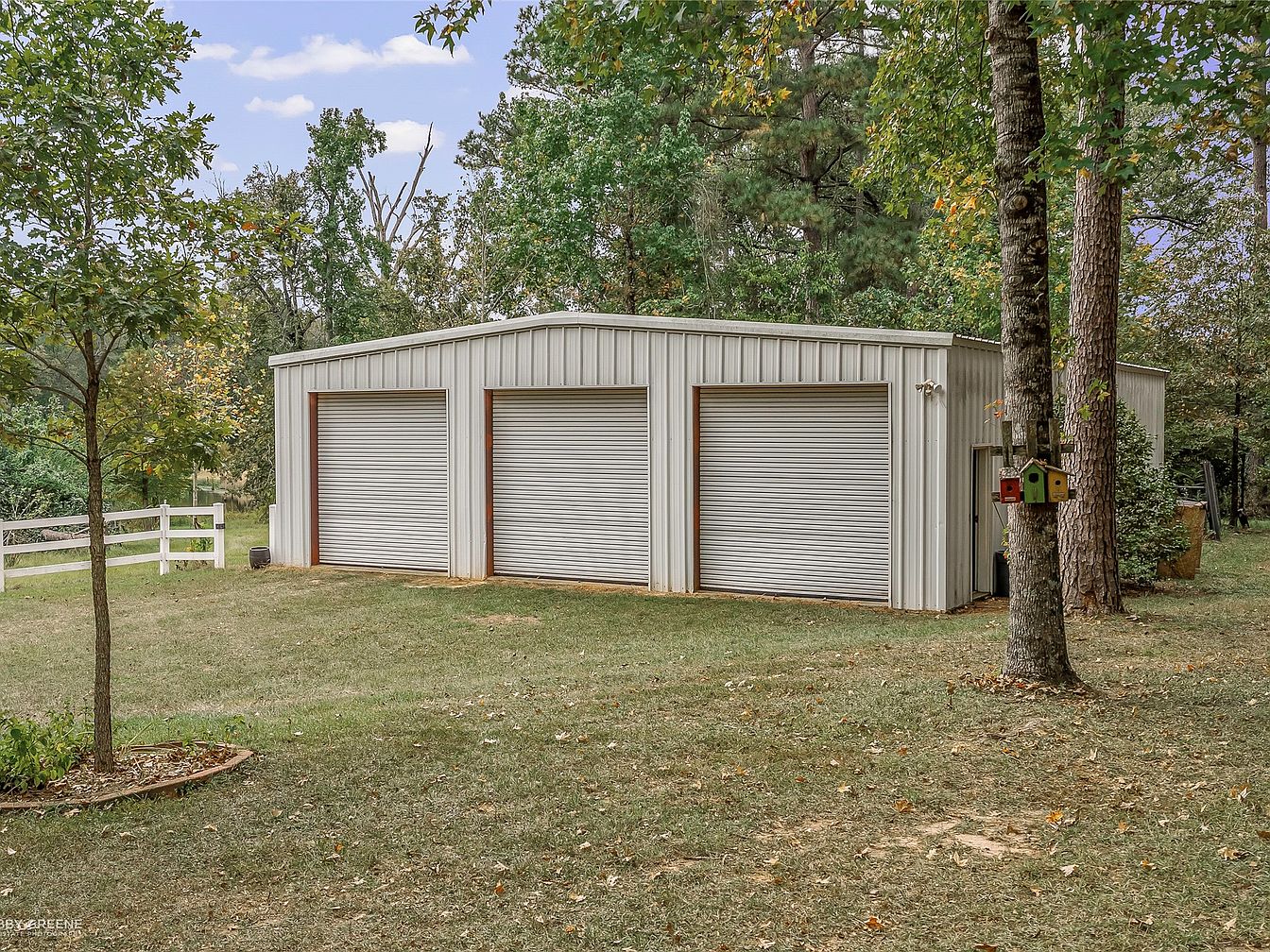 This spacious outdoor storage shed features a durable metal exterior with three sleek roll-up doors, providing easy access to ample storage for tools, vehicles, or outdoor equipment. Surrounded by lush greenery and mature trees, it harmonizes beautifully with the natural landscape, offering a serene escape from urban life. The well-maintained lawn provides an inviting area for family activities and relaxation, while nearby trees add shade and visual interest. Additionally, decorative items, like the colorful birdhouses, enhance the charm, making this shed not just functional but also a pleasant part of the property’s aesthetic appeal.
