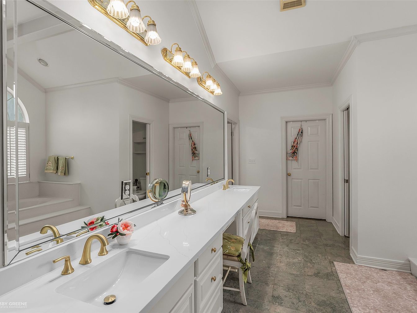 This elegant bathroom suite features a spacious layout with a double vanity, enhancing both function and style. The countertop gleams with a smooth, white surface that contrasts beautifully with the sleek, gold fixtures. Abundant natural light pours in from the tall window, complemented by soft white and pastel accents, creating a serene atmosphere. The ceramic tile flooring combines durability with sophistication, while plush area rugs add a touch of comfort. Thoughtfully designed with family-friendly features, including ample storage and a separate tub area, this space balances practicality with a timeless elegance, perfect for daily rituals and relaxation.