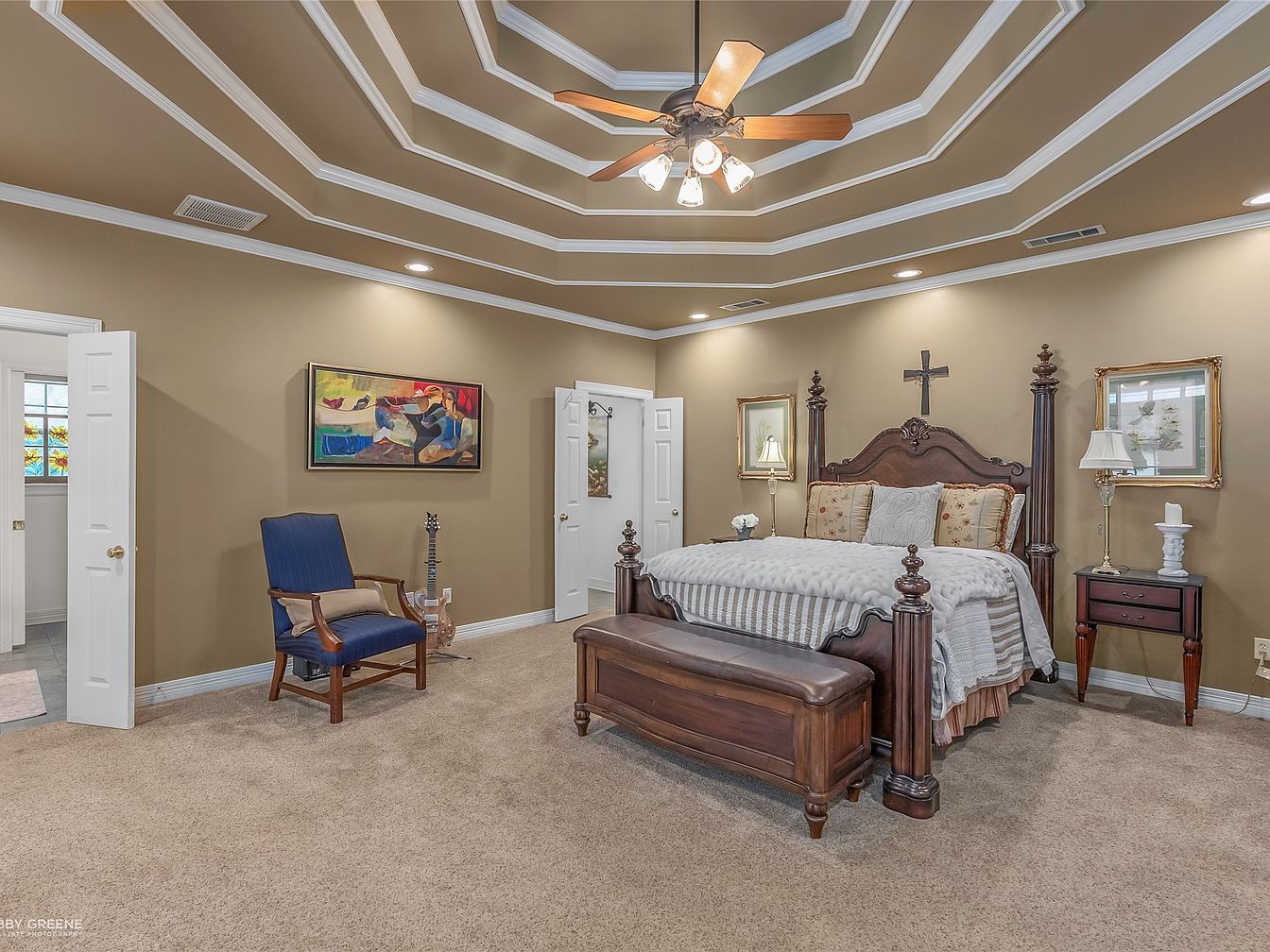 This spacious master bedroom features a stunning coffered ceiling that adds depth and elegance to the design. Soft beige walls create a warm ambiance, enhancing the cozy atmosphere. The room is anchored by a beautifully crafted wooden bed, adorned with decorative pillows, while a plush, striped throw provides an inviting touch. Flanking the bed are stylish nightstands with lamps that offer soft lighting. A comfortable, upholstered chair invites relaxation, complemented by tasteful art and decor that reflects an artistic flair. With ample natural light and a thoughtfully arranged layout, this space is perfect for unwinding in a serene environment.