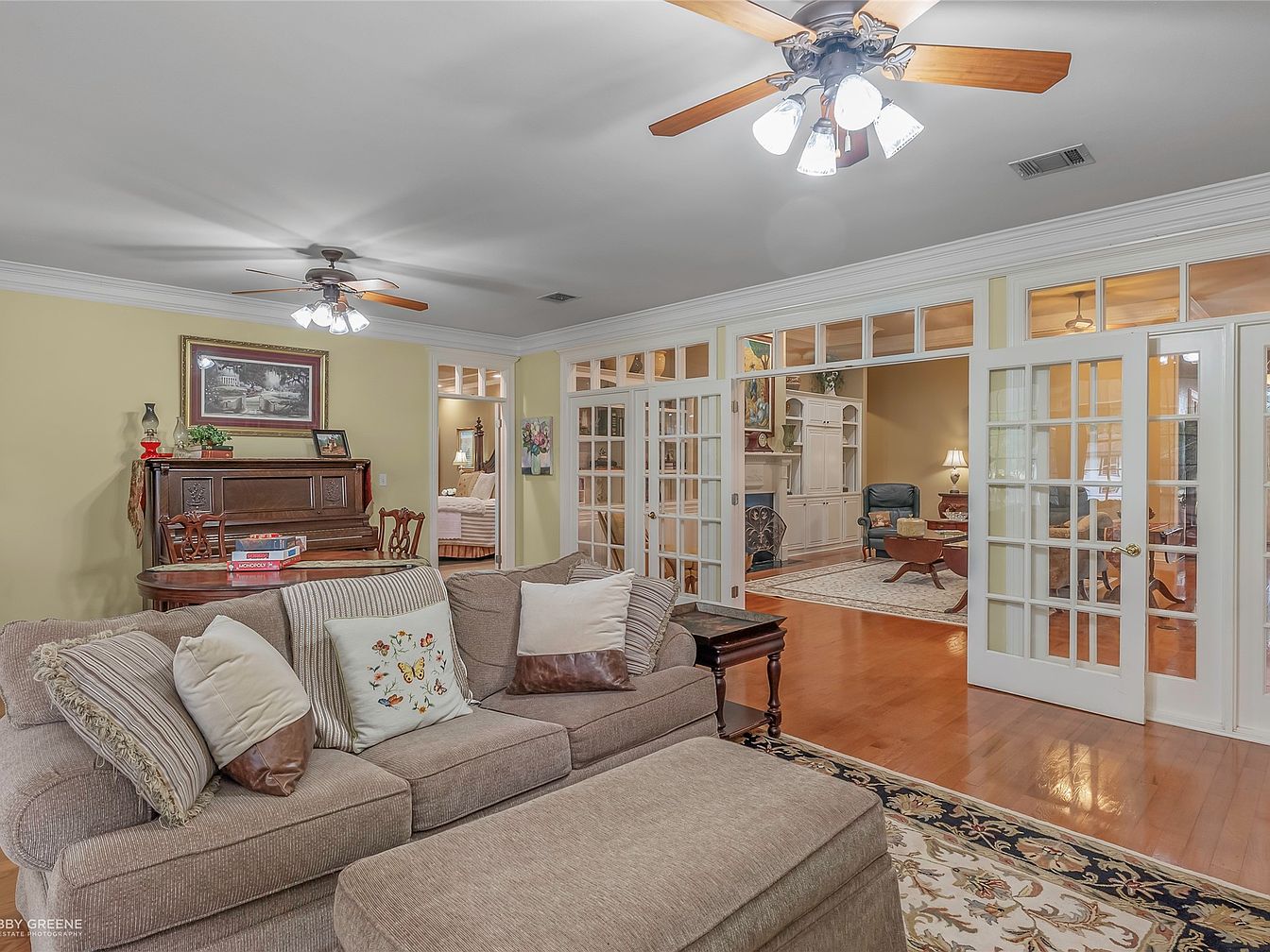 This inviting living room combines comfort and elegance, featuring a spacious layout enhanced by natural light. The soft yellow walls create a warm ambiance, complemented by a plush sectional sofa adorned with decorative cushions. A vintage piano adds a musical touch, enticing family gatherings. Beautifully designed French doors connect to other areas, promoting an airy flow throughout. Rich hardwood floors offer a classic appeal, while a patterned rug anchors the seating area. Nearby, tasteful artwork and plants add character, fostering a cozy, family-friendly atmosphere perfect for relaxation and entertaining. Thoughtful design elements make this space truly welcoming.