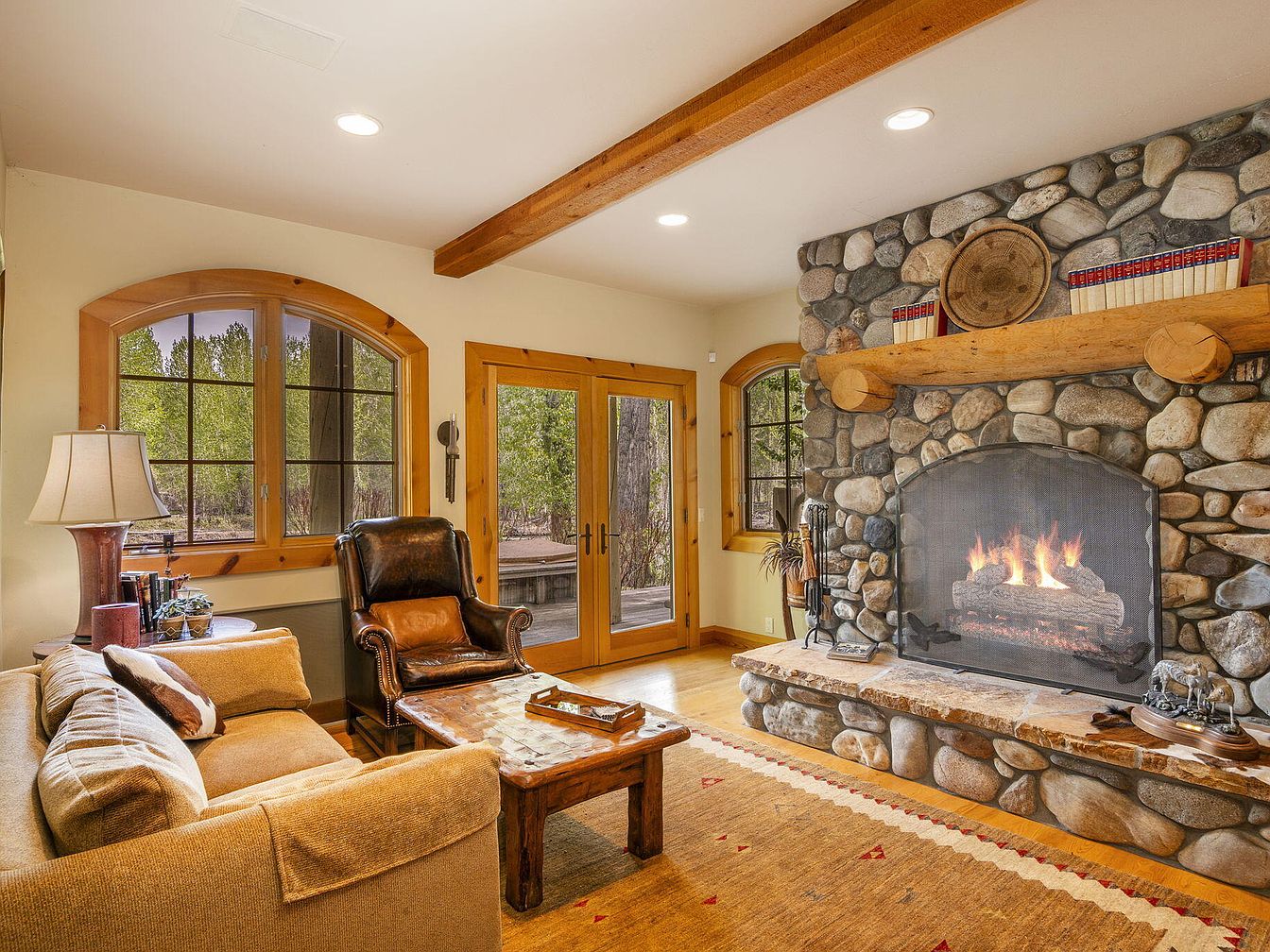 Warmth and relaxation fill this welcoming living room, anchored by a striking stone fireplace and timber mantel. Large arched windows and glass-paned doors flood the space with natural light, highlighting the inviting blend of wood accents and soft, earth-tone furnishings. The comfortable sofa and classic leather armchair are perfect for family gatherings or quiet afternoons, while the sturdy coffee table offers a central spot for board games or snacks. Exposed ceiling beams and a woven rug add rustic character and cozy charm, making this room an ideal retreat for both adults and children to gather and unwind together.