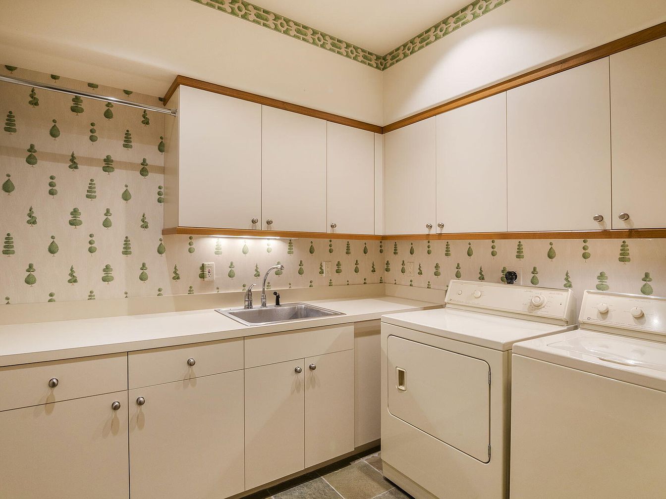 A spacious and organized laundry room featuring crisp, cream-colored cabinetry that provides ample storage for linens and household essentials. The countertops offer generous workspace for sorting and folding laundry, while a stainless steel sink is conveniently integrated for easy handwashing. A washer and dryer are side by side, making the space family-friendly and efficient for busy households. Cheerful green-patterned wallpaper and matching trim add a playful yet calming touch. Recessed lighting under the cabinets enhances visibility, creating a bright, clean ambiance. Sleek metal knobs and balanced design elements give this utility space a fresh, inviting modern feel.