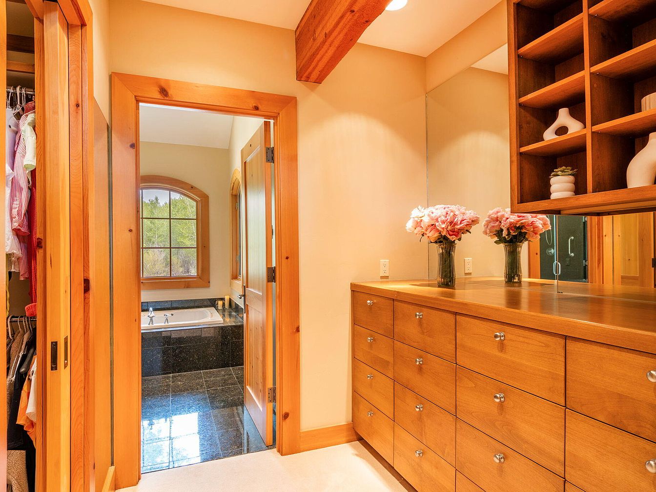 A spacious walk-in closet features warm natural wood cabinetry and trim for a cozy, inviting feel. Ample drawers and open shelving provide plenty of storage, keeping the space organized for a busy family. A large mirror above the vanity enhances brightness and makes the area perfect for getting ready. Decorative touches like fresh flowers and modern ceramic vases add elegance, while the neutral cream walls create a calm backdrop. To the left, a walk-in wardrobe offers accessible hanging space. The area opens into a luxurious bathroom with a soaking tub and a picturesque window, seamlessly blending comfort and practicality.