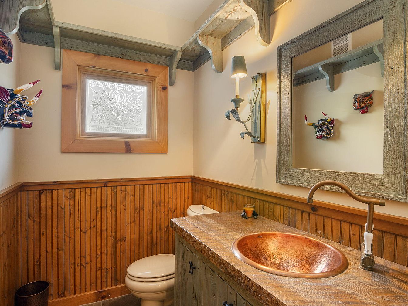 Warm wood paneling wraps around the lower walls, complemented by a unique copper sink set into a distressed wood vanity, creating a cozy and inviting atmosphere. The countertop and mirror frame both feature weathered textures, adding character to the space. A decorative etched window brings in soft, natural light while ensuring privacy, and whimsical wall-mounted mask art adds a playful, family-friendly touch. Open wood shelving above adds visual interest and provides space for decorative items or storage. Soft cream-colored upper walls balance the wood tones, enhancing the room’s bright, welcoming vibe, perfect for both guests and daily family use.