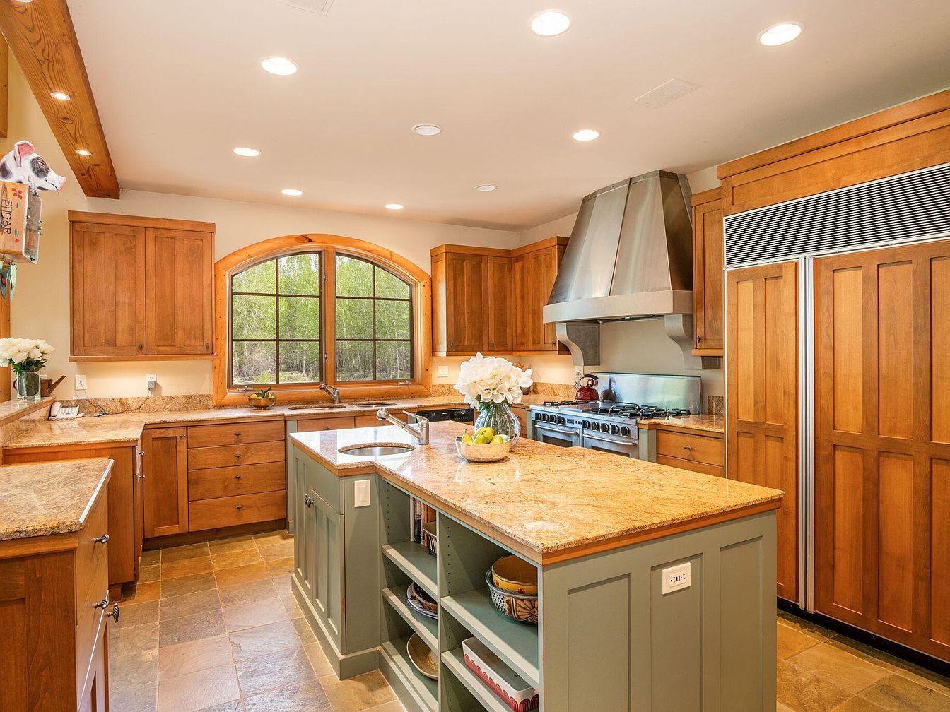 Warm wood cabinetry lines the spacious kitchen, complemented by a large island with soft sage paneling and integrated shelving for added storage. Natural stone countertops and earth-toned floor tiles contribute to the cozy and inviting feel. Stainless steel appliances, including a commercial-style range and hood, offer modern convenience while blending seamlessly with the rustic aesthetic. Large windows above the sink fill the room with natural light and provide scenic outdoor views, ideal for family gatherings or casual mornings. Abundant counter space, open shelving, and thoughtful electrical outlets cater to both practicality and a family-friendly environment.