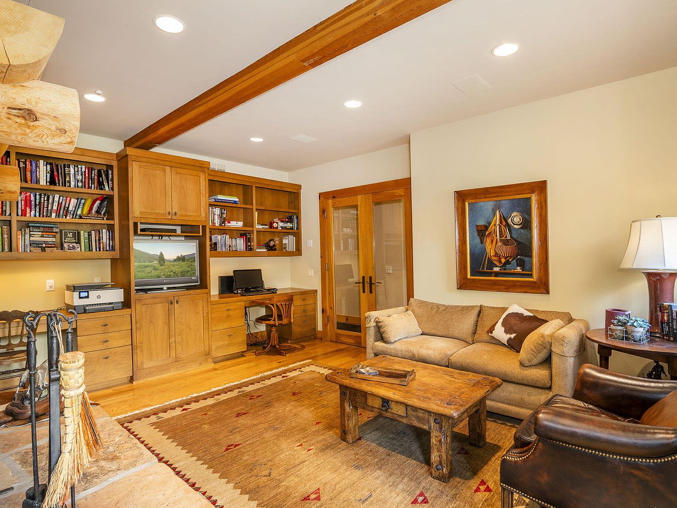 Warm wood cabinetry lines one wall, offering integrated shelving for books, a TV nook, and a convenient desk area, perfect for work or homework. A cozy tan sofa and a rich leather armchair gather around a rustic wooden coffee table atop a natural fiber rug, creating a welcoming space for family relaxation. Earthy tones and natural textures define the color scheme, complemented by a large framed still-life painting. Exposed wood beams, large log accents, and glass-paneled doors add character, while a fireplace implements comfort and functionality, making this a perfect spot for both productivity and togetherness.