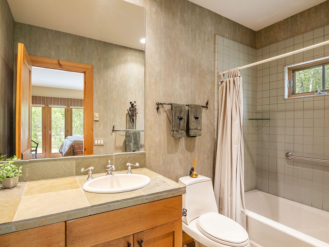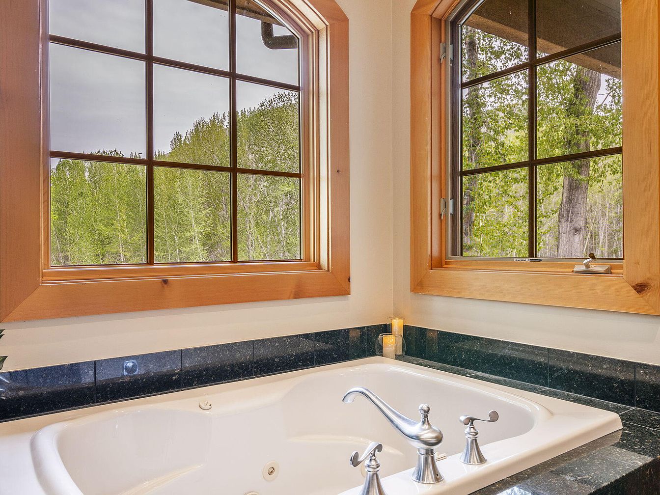 This inviting bathroom features a luxurious soaking tub nestled in a corner surrounded by large, wood-framed windows, providing natural light and serene forest views ideal for relaxation. The deep, jetted tub is set against polished granite counters, adding a touch of elegance and durability. Softly glowing candles on the ledge offer a cozy, spa-like ambiance perfect for family use or quiet moments alone. The neutral walls and quality chrome fixtures balance rustic charm with modern sophistication, making this space both family-friendly and calming, ideal for unwinding after a busy day while enjoying the connection to nature just outside.